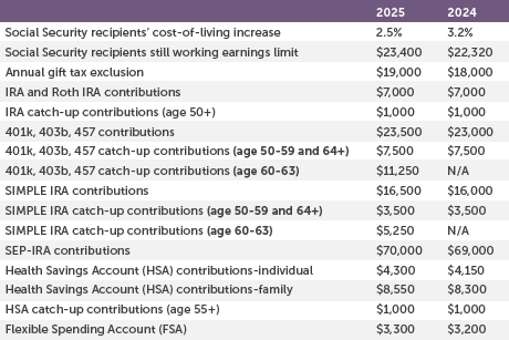 Due to inflation, Social Security recipients will again receive a cost-of-living increase. Retirement savers with access to an employer-sponsored plan also received an increase in contribution limits for 2025. If you are contributing to an account with an increased limit, be sure to update your contribution rates for next year to take advantage of these changes.